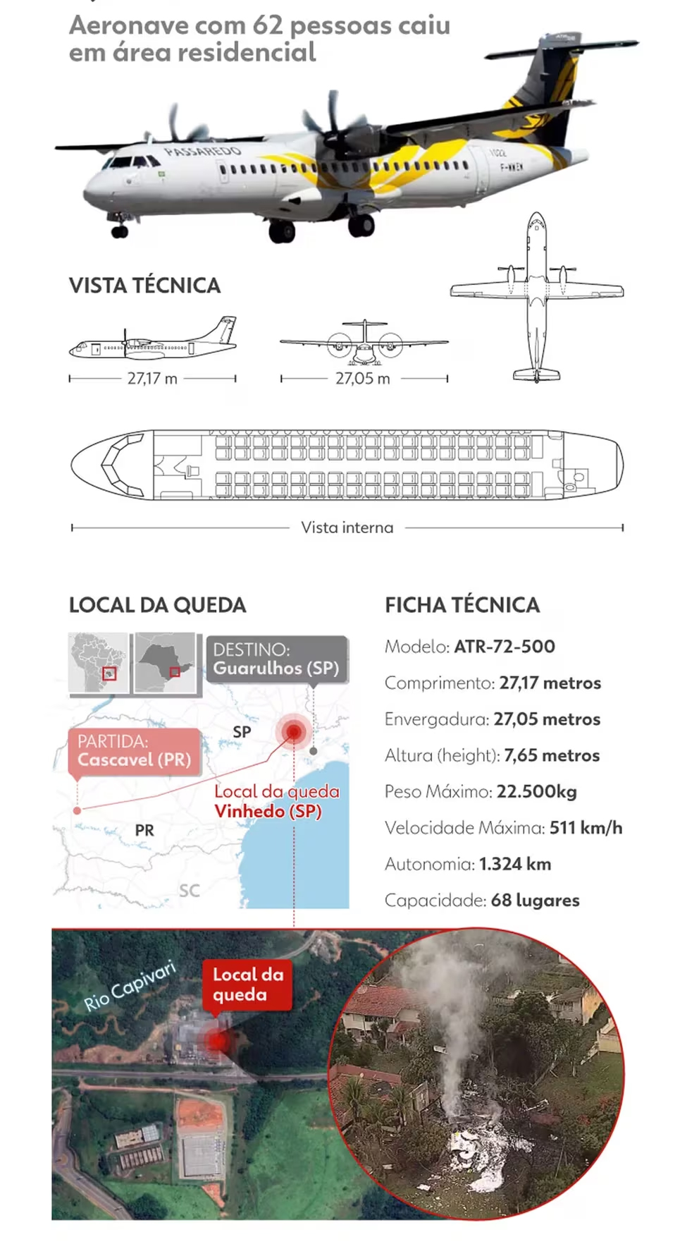 Según confirmó la aerolínea, VOEPASS Linhas Aéreas, se trataba de un avión turbohélice modelo ATR-72 que cubría la ruta Cascavel – Guarulhos. Este modelo tiene capacidad para transportar a 68 pasajeros aunque no iba completo.