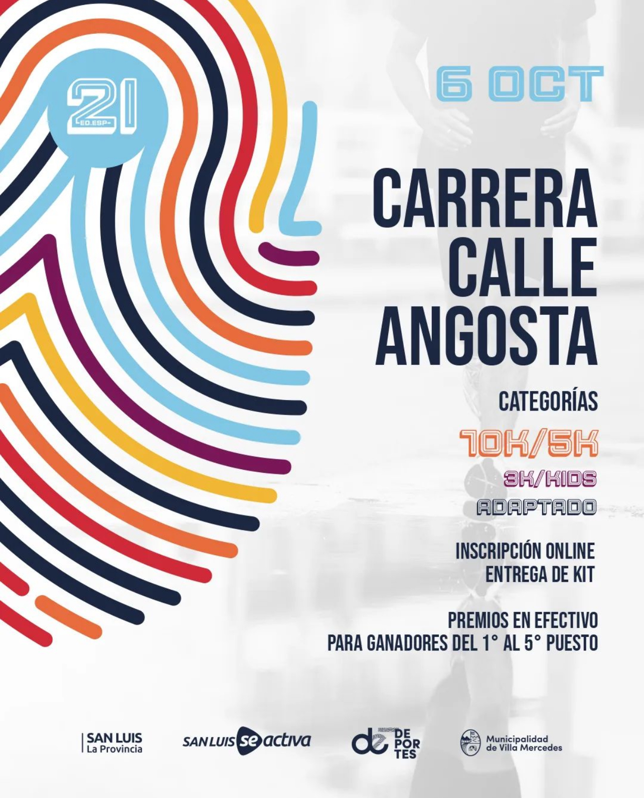 Los 10k de la Calle Angosta se llevarán a cabo el próximo 6 de octubre en Villa Mercedes. La carrera es organizada por la secretaría de Deportes, la municipalidad de Villa Mercedes y la Federación Atlética Sanluiseña como parte del programa ‘San Luis se Activa’. El evento será una continuidad de los 10k de Juana Koslay y los 10k ‘Del Maestro’ en San Francisco del Monte de Oro, que contaron con la participación de casi dos mil corredores de la provincia y la región.