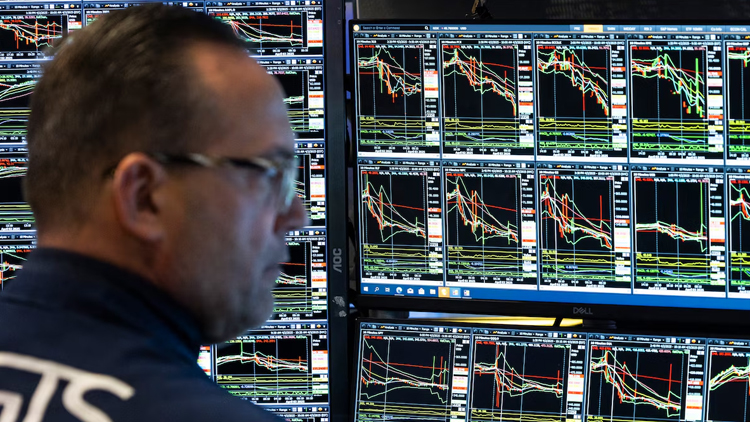 Un corredor de bolsa observa este jueves, 3 de abril, varias pantallas que muestran la variación de los indicadores bursátiles en la Bolsa de Valores de Nueva York, en Wall Street (NY, EE.UU.). EFE/Justin Lane