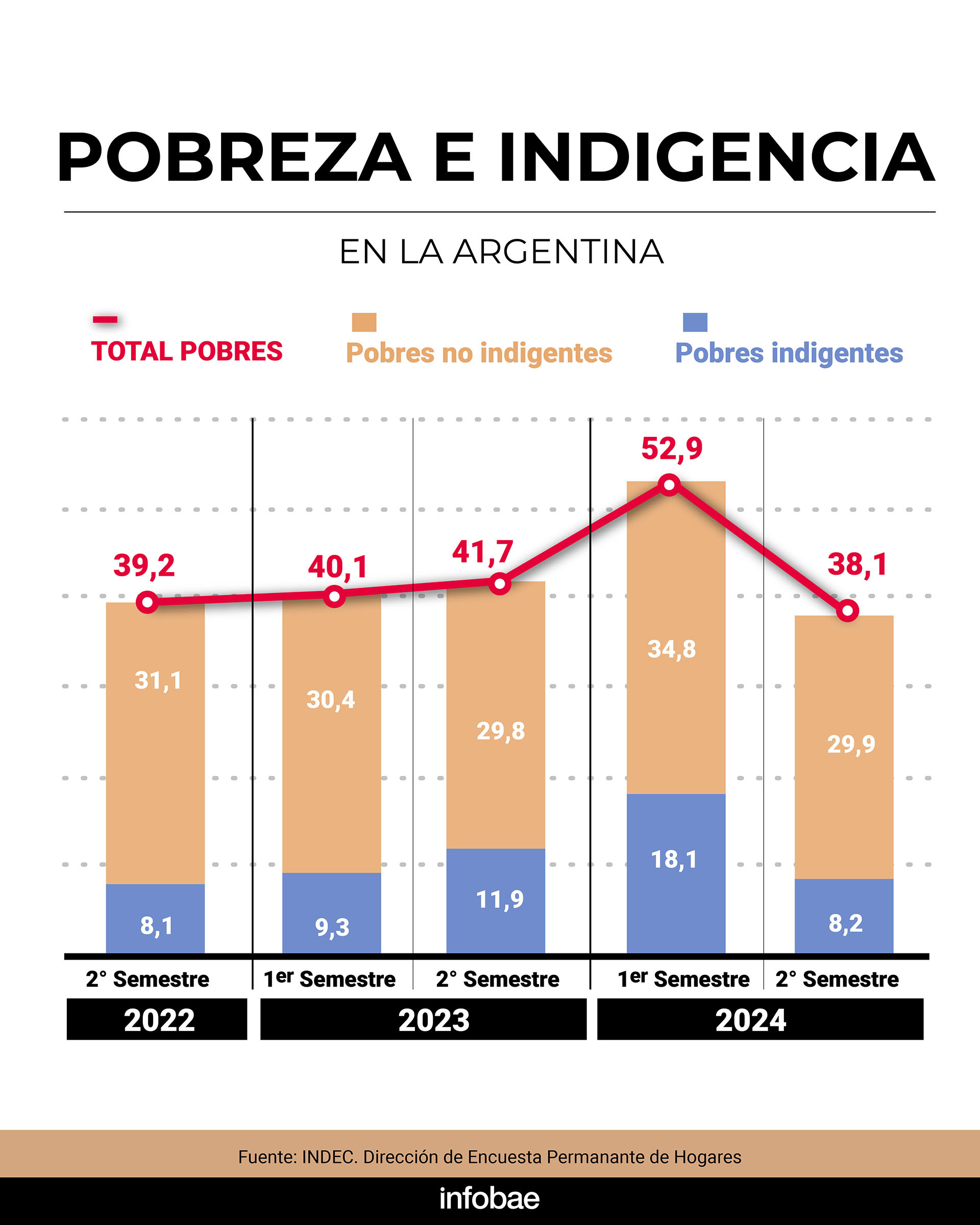 La pobreza afectó al 38,1% de la población al cierre de 2024, informó este lunes el Indec. El indicador oficial, así, mostró una considerable caída en comparación con el 52,9% que había registrado en el primer semestre de 2024, influido por la aceleración de precios de esa primera mitad del año y también una caída respecto al 41,7% que había marcado el organismo estadístico para el cierre de 2023.