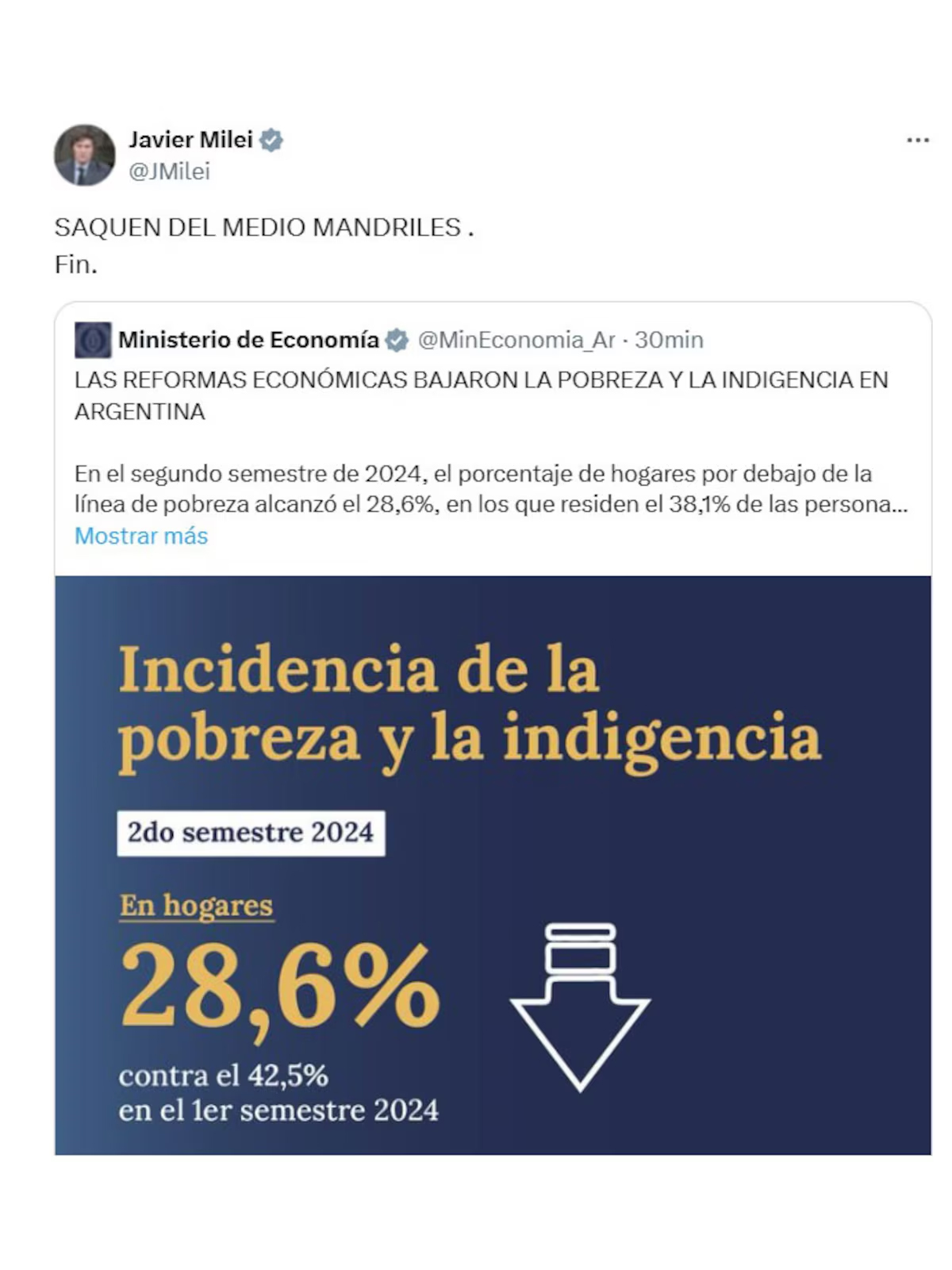 “La pobreza sin precedentes que había dejado el gobierno de Alberto Fernández, Cristina Kirchner y Sergio Massa, que llegó a un pico del 52,9% en la medición del primer semestre de 2024, se redujo al 38,1% en el segundo semestre, mientras que la indigencia disminuyó del 18,1% al 8,2%, como efecto directo de la lucha contra la inflación que ha llevado adelante el Presidente Javier Milei, además de la estabilidad macroeconómica y la eliminación de restricciones que durante años limitaron el potencial económico de los argentinos”, indicó un comunicado de la Oficina de Presidencia tras la información del Indec.