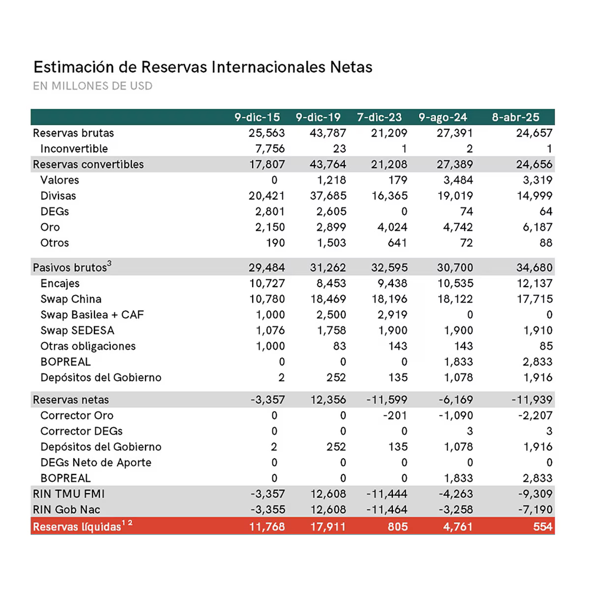 Según datos de la consultora EcoGo las reservas del BCRA tocaron el 7 de enero un máximo de USD 32.903 millones gracias al impulso del blanqueo de capitales y los créditos en dólares que tomaron los exportadores, motivados por el carry trade. Los datos de la consultora muestran que desde ese momento las reservas brutas cayeron en USD 8.246 millones. Si se descuentan los pasivos, las reservas netas bordean los USD 12.000 millones negativos. Son niveles similares a los que había heredado Milei aunque en el medio operaron pagos de deuda “cash”, la vigencia del dólar blend e intervenciones directas sobre la brecha cambiaria.