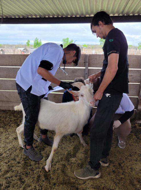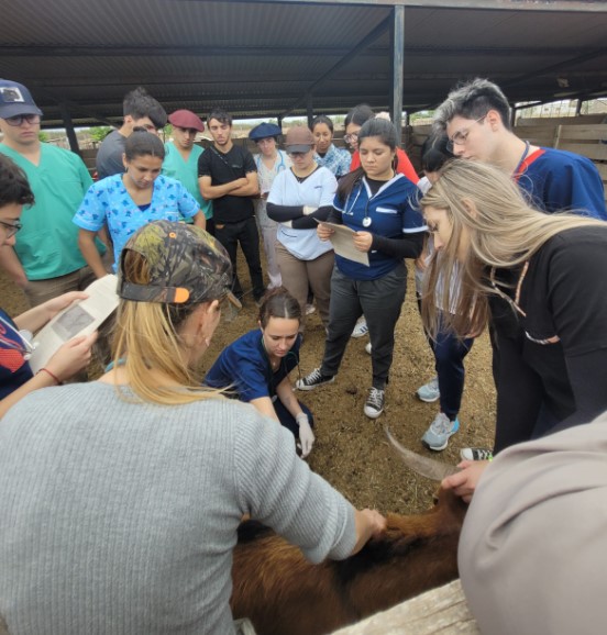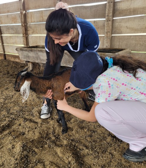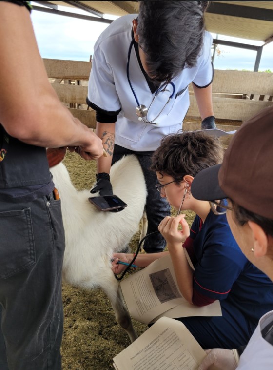 “Hicimos revisión de las constantes fisiológicas normales en pequeños rumiantes, evaluación de mucosas, evaluación de áreas de proyección cardíaca y pulmonar, termometría, cronología dentaria e incluso pudimos realizar técnicas de extracción de sangre y atención primaria de heridas en cerdos”, explicó la docente a cargo y médica veterinaria Myriam Pereyra.