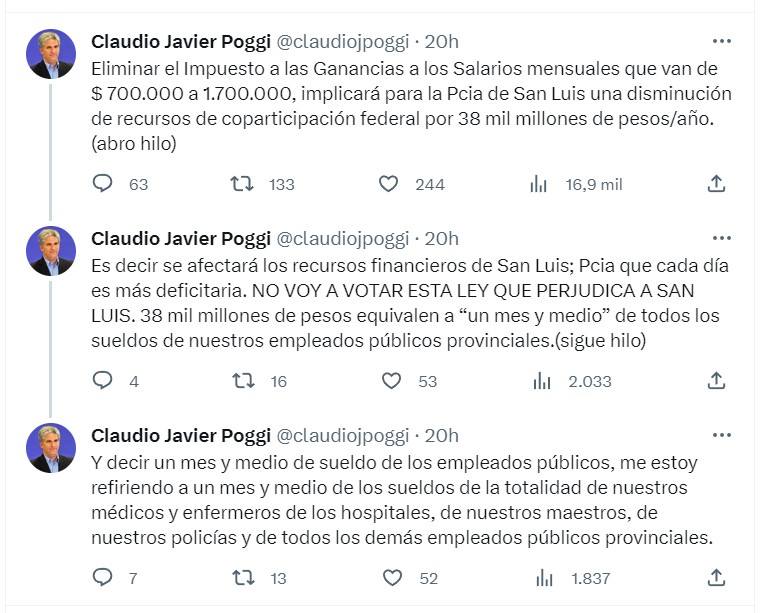 A través de un hilo en la red social X, Claudio Poggi sentó posición sobre la eliminación de Ganancias que impulsa el ministro de Economía, Sergio Massa y que se está tratando en estos momentos en la Cámara Baja de la Nación.