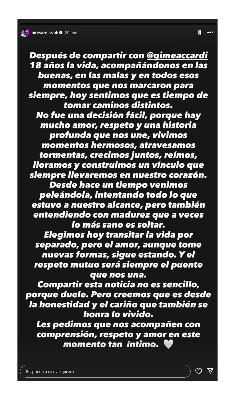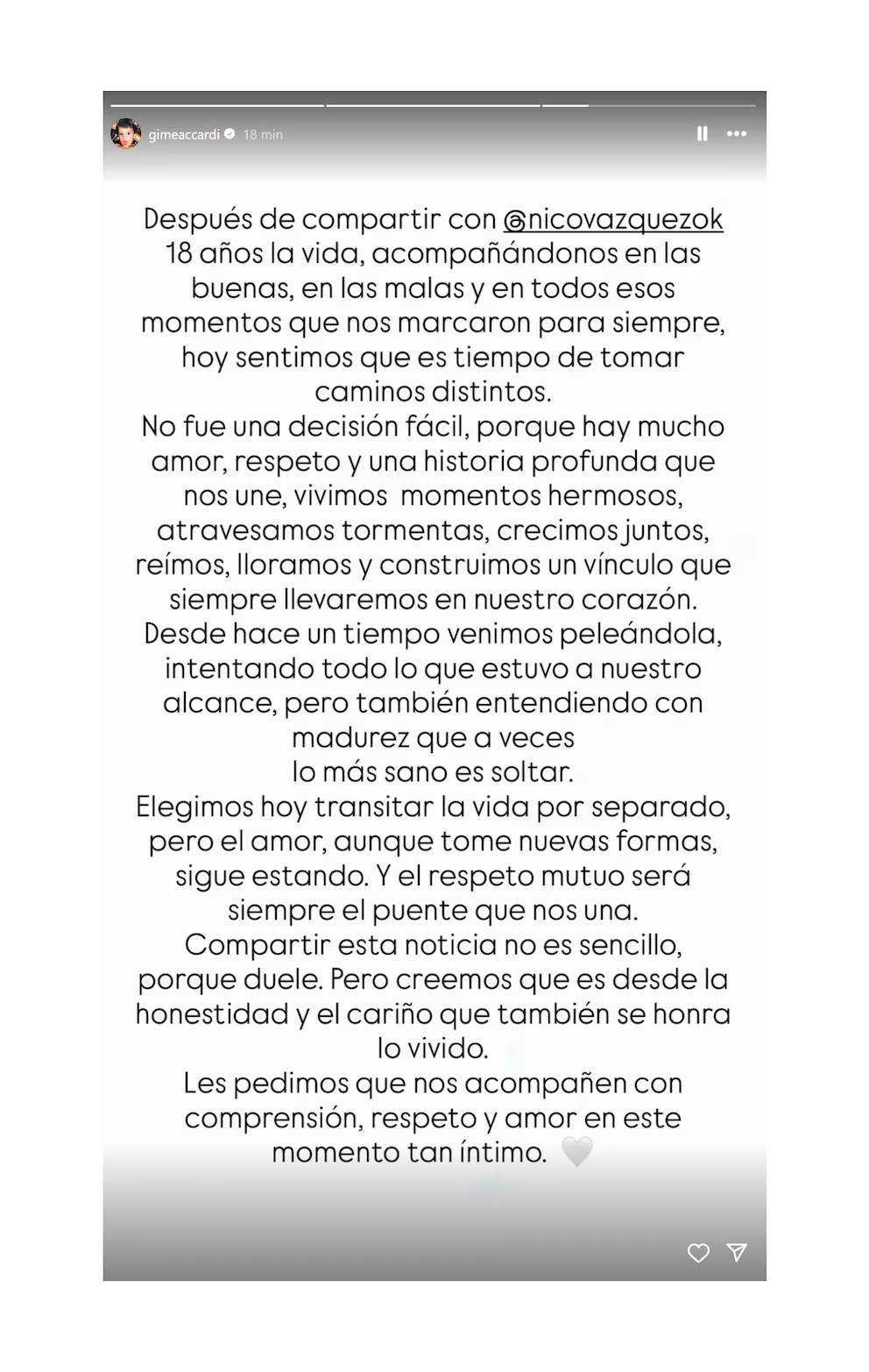 Después de compartir con Nico Vázquez 18 años de la vida, acompañándonos en las buenas, en las malas y en todos esos momentos que nos marcaron para siempre, hoy sentimos que es tiempo de tomar caminos distintos”, comenzaba diciendo el comunicado que ambos compartieron en sus perfiles.