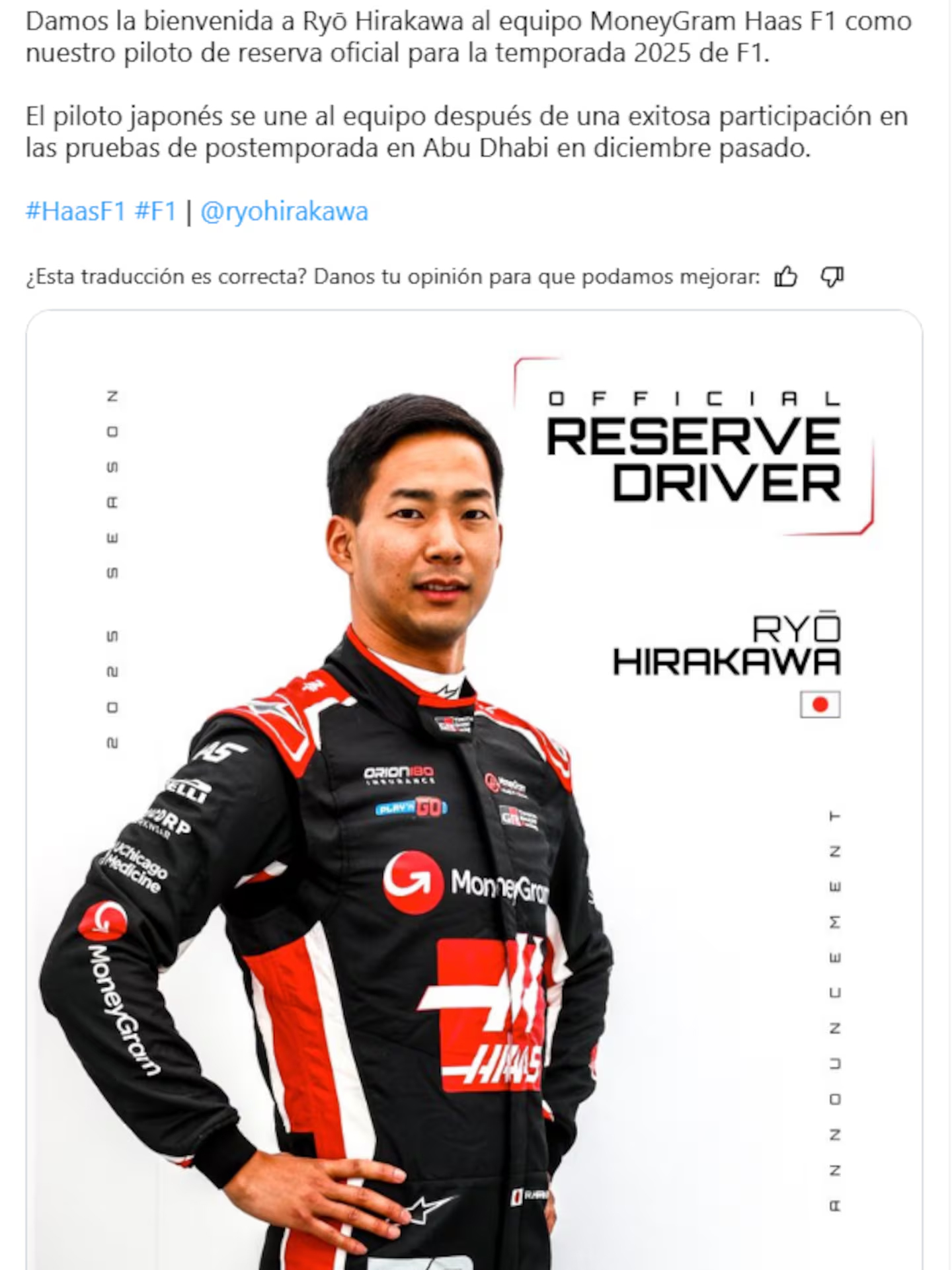 El japonés Ryo Hirakawa, uno de los compañeros de Franco Colapinto en la escudería Alpine, decidió convertirse en nuevo piloto de reserva del equipo Haas, en una noticia que sorprendió al mundo de la Fórmula 1.
