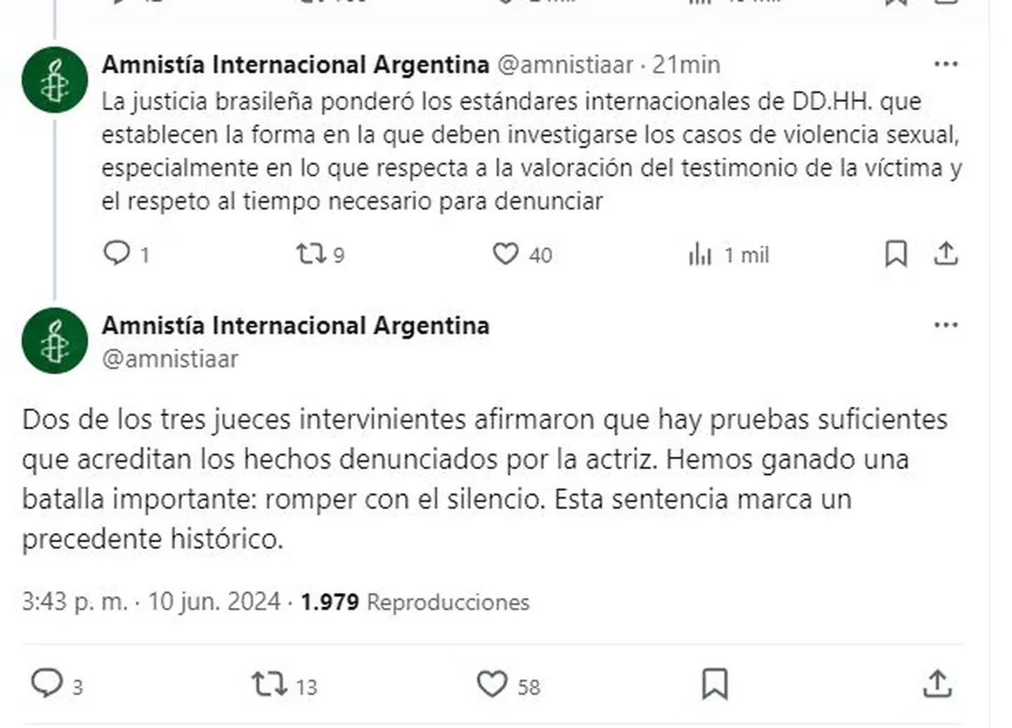 La justicia de Brasil declaró la culpabilidad del actor en el juicio por violación contra Thelma Fardin. Los jueces enviaron un claro mensaje de justicia. Firme paso en la lucha por los derechos de las víctimas de violencia sexual y de género. pic.twitter.com/FldhNraZa1— Amnistía Internacional Argentina (@amnistiaar) June 10, 2024