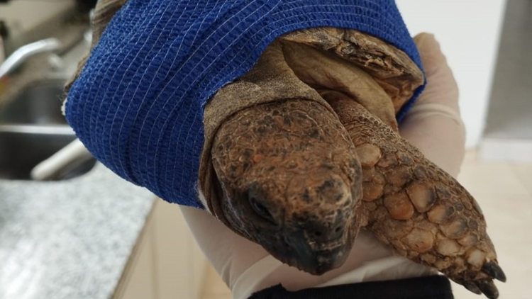 La pequeña tortuga ha sido mutilada, pero se recupera gracias a la asistencia veterinaria. Una decena de tortugas terrestres integran el plantel permanente de la Reserva Floro Faunística de La Florida. Es importante remarcar una problemática entre los animales domesticados y los silvestres que buscan reinsertarse en su hábitat: la transmisión de enfermedades y parásitos, fruto de esa interacción.