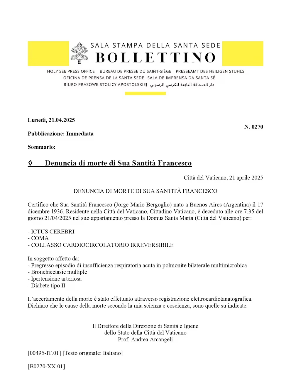 “Certifico que Su Santidad Francisco (Jorge Mario Bergoglio) nacido en Buenos Aires (Argentina) el 17 de diciembre de 1936, residente en la Ciudad del Vaticano, Ciudadano del Vaticano, falleció a las 7.35 horas del día 21/04/2025 en su piso de la Domus Santa Marta (Ciudad del Vaticano) de: un derrame cerebral, coma y colapso cardiovascular irreversible”, dice el comunicado oficial.