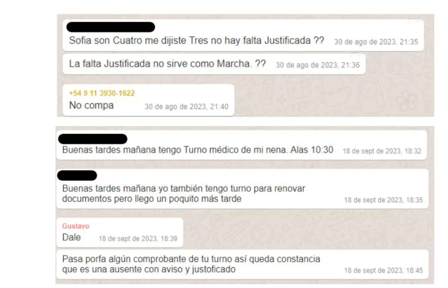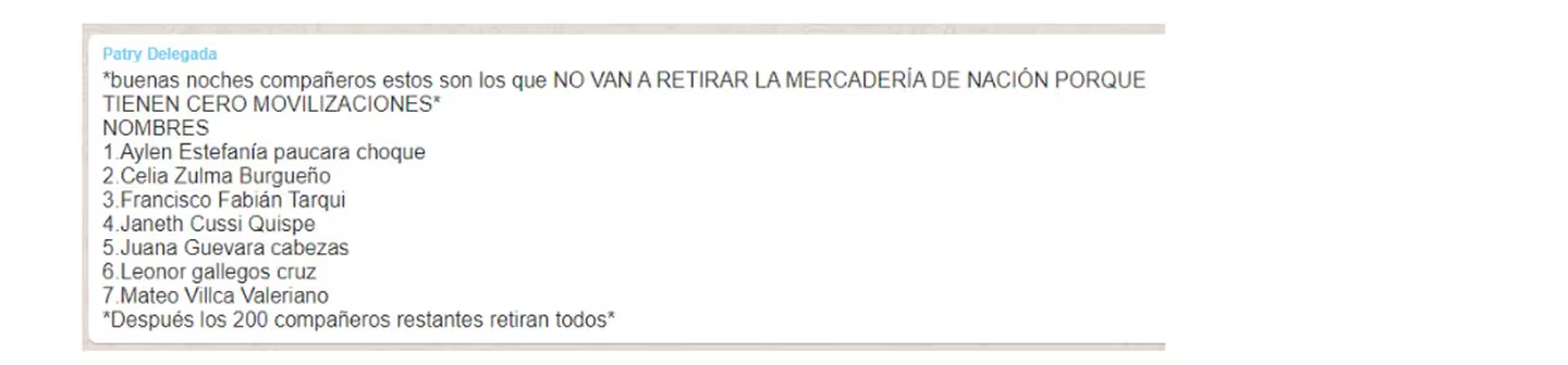 En el expediente hay diferentes pruebas. Una de estas ocurrió con una mujer identificada como Patricia Iramain, una delegada que en un chat informa quiénes son los que no van a poder pasar a retirar la mercadería ya que no fueron a las marchas.