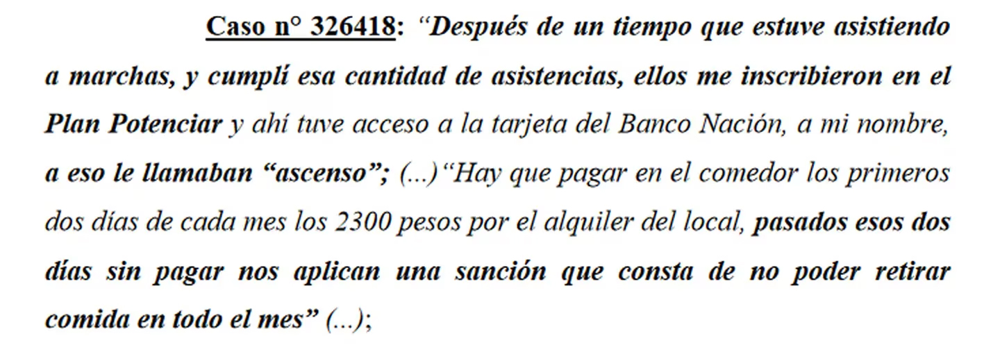 En otro tramo del expediente, el fiscal concluye en que se implementó un sistema de control y de sanciones sobre las víctimas, que incluyó la toma de asistencia a las “movilizaciones”, la confección de “listas de castigados” que debían “reparar” su acción mediante el cumplimiento de nuevas tareas, la imposición de multas por faltar a una “marcha” de hasta $10.000 por cada ausencia, la exigencia de “justificar” las ausencias a las “movilizaciones” con “comprobantes” de los respectivos impedimentos turnos médicos, trámites, etc, y la prohibición de retirar raciones de comida o alimentos no perecederos por plazos determinados, según cada “incumplimiento”, entre otros mecanismos.