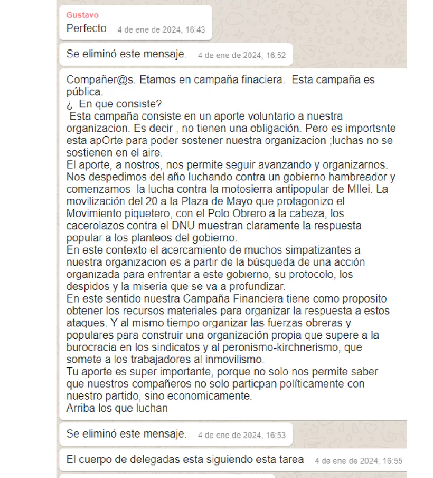 Otra de las capturas que se pueden encontrar en el caso es del referente Gustavo Vasquez, pide un aporte mensual a los beneficiarios para “sostener a la organización”. Allí habla de luchar contra la motosierra de Milei.