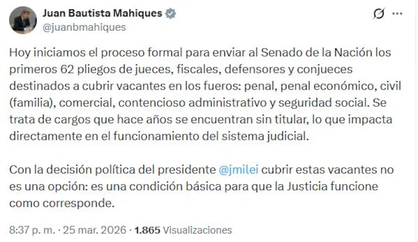 Mahiques indicó que se trata de cargos que hace años se encuentran sin titular, lo que impacta directamente en el funcionamiento del sistema judicial. “Con la decisión política del presidente Milei, cubrir estas vacantes no es una opción: es una condición básica para que la Justicia funcione como corresponde”, remarcó el funcionario.
