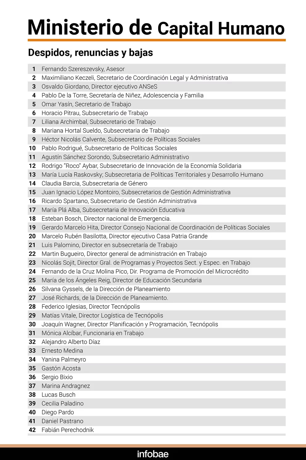 Pero la mayoría de las renuncias, despidos y designaciones no completadas están concentradas en el Ministerio de Capital Humano, que encabeza Sandra Pettovello: de las 42 bajas que tenía hasta la salida Fernando Szereszevsky (ver tabla), se le agregó en las últimas horas el caso de Lucas Fernández Aparicio, un dirigente con pasado en el PRO que había sido convocado el mes pasado para asumir como jefe de Gabinete, pero nunca llegó a ser designado y su destino quedó en suspenso.