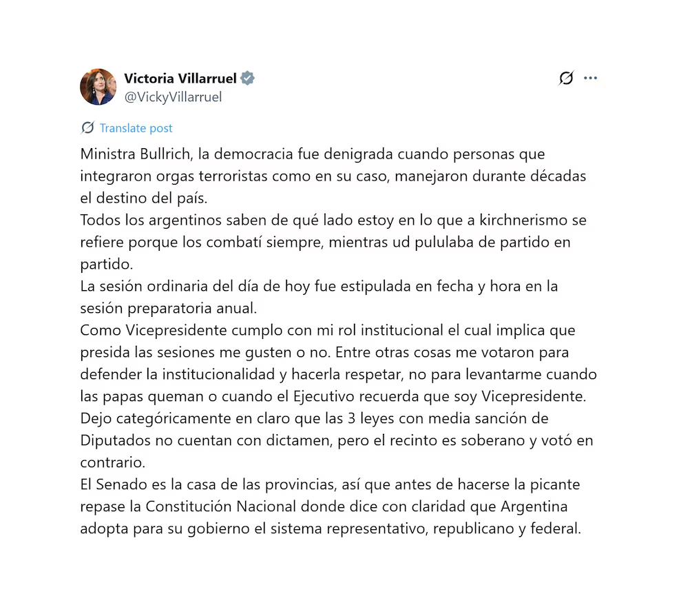 Mientas que en otro posteo agregó más fundamentos para justificar su accionar: “Aprovecho para aclarar que el H. Senado como Cuerpo es soberano conforme la Constitución Nacional y el sistema republicano de gobierno. El ejercicio de mi función no implica la convalidación de ningún acto, ya que son los senadores, en representación de los intereses de sus provincias, los que toman sus propias decisiones. Son ellos quienes convalidan, aprueban o rechazan y son quienes deben encontrar los caminos de diálogo y consenso en el desarrollo de su labor en el recinto y en las comisiones, de acuerdo a sus convicciones y de conformidad con el Reglamento”.