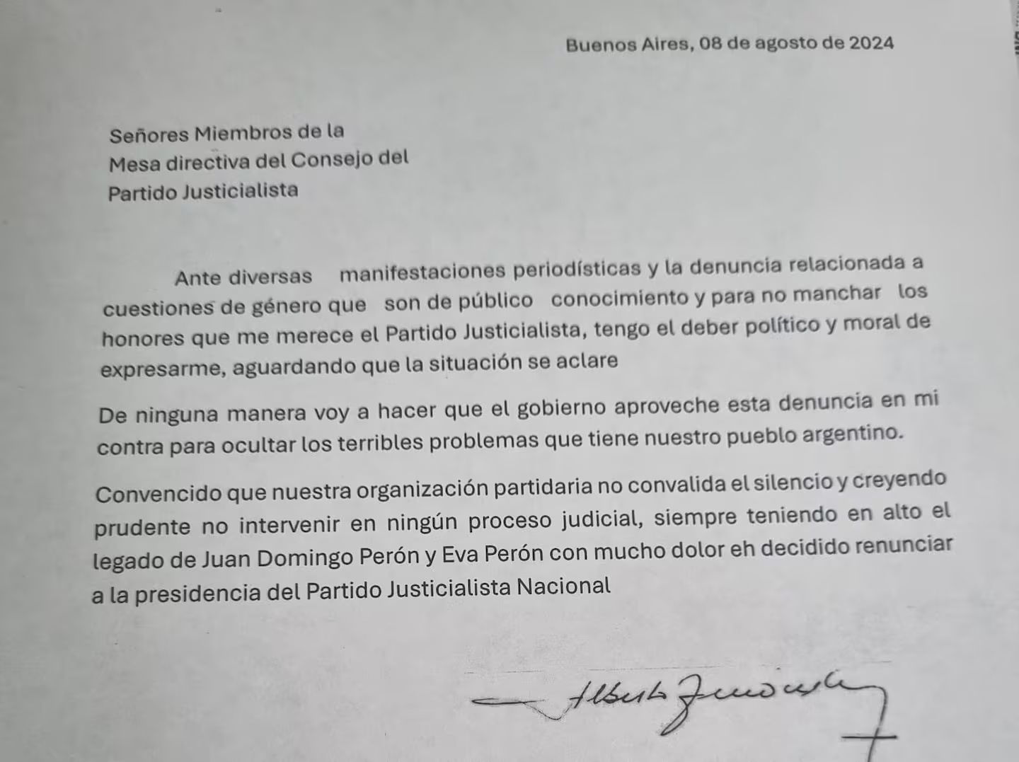 Convencido que nuestra organización partidaria no convalida el silencio y creyendo prudente no intervenir en ningún proceso judicial, siempre teniendo en alto el legado de Juan Domingo Perón y Eva Perón con mucho dolor, he decidido renunciar a la presidencia del Partido Justicialista Nacional.