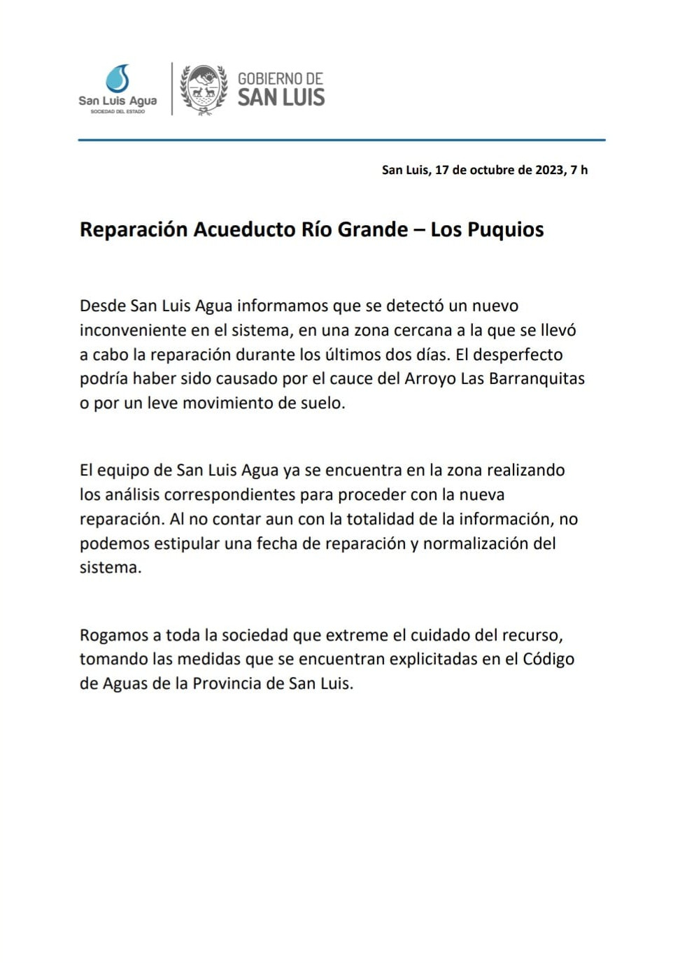 Desde San Luis Agua informaron que se detectó un nuevo inconveniente en el sistema, en una zona cercana a la que se llevó a cabo la reparación durante los últimos dos días. El desperfecto podría haber sido causado por el cauce del arroyo Las Barranquitas o por un leve movimiento de suelo. El equipo de San Luis Agua ya se encuentra en la zona realizando los análisis correspondientes para proceder con la nueva reparación. Al no contar aun con la totalidad de la información, no pueden estipular una fecha de reparación y normalización del sistema. Solicitan a toda la sociedad que extreme el cuidado del recurso, tomando las medidas que se encuentran explicitadas en el Código de Aguas de la Provincia de San Luis.