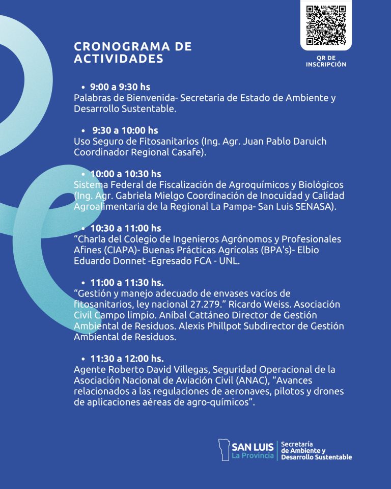 Las charlas serán impartidas por técnicos de la secretaría de Ambiente, la Asociación Civil CampoLimpio, la Cámara de Sanidad Agropecuaria y Fertilizantes (CASAFE), el Instituto Nacional de Tecnología Agropecuaria (INTA), Green Drone, el Colegio de Ingenieros Agrónomos y Profesiones Afines (CIAPA), la Universidad Nacional de San Luis (UNSL), el Servicio Nacional de Sanidad y Calidad Agroalimentaria (SENASA) y la Agencia Nacional de Aviación Civil (ANAC).