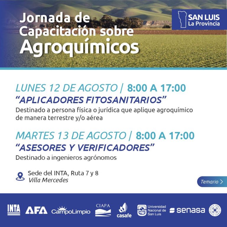 Será los días 12 y 13 de agosto en la sede del INTA, estará destinada a aplicadores fitosanitarios e ingenieros agrónomos que sean asesores y/o verificadores de estos productos.
