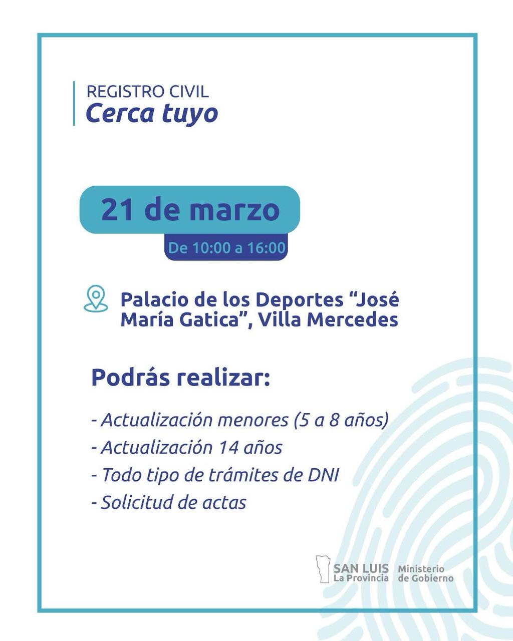 El Registro Civil cumplirá una nueva jornada itinerante en Villa Mercedes. Será este viernes, de 10:00 a 16:00 en el Palacio de los Deportes. Se otorgarán 80 turnos.