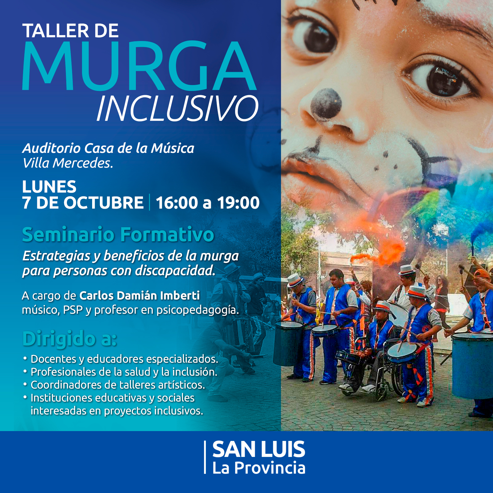 La secretaría de Personas con Discapacidad organizó un seminario formativo que explora la murga como herramienta inclusiva para trabajar con personas con discapacidad. El taller, que se dictará el lunes 7 de octubre de 16:00 a 19:00, en el Auditorio de la Casa de la Música de Villa Mercedes, está destinado a docentes y educadores especializados, profesionales de la salud, coordinadores de talleres artísticos, instituciones educativas y sociales.