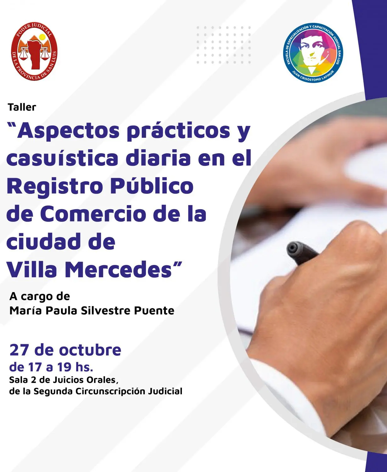 Destinado para jóvenes abogados/as de la ciudad de Villa Mercedes, hoy a partir de las 17 horas se realizará el taller “Aspectos prácticos y casuística diaria en el Registro Público de Comercio de la ciudad de Villa Mercedes”, a cargo de María Paula Silvestre Puente, Jefa de la Oficina del Registro Público de Comercio.